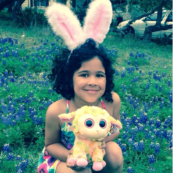Happy Easter to everyone. Today begins week 16 of The 52 Project. I am posting a shot of D., my seven-year-old grand-daughter. Unfortunately, she is the only one of my 6 ¾ grandchildren who was able to spend Easter with us, but fun was had by all. In between the cooking, Easter egg hunts, eating, and other excitement, I coaxed her to sit among a patch of Texas blue bonnets. Of course, she insisted that her new stuffed animal be included in the photograph. I think that both of them are little cuties. (Now, if I had any Photoshop skills, I am certain that I could have gotten rid of the car in the top right background, but alas, lacking that skill, the car stays.)